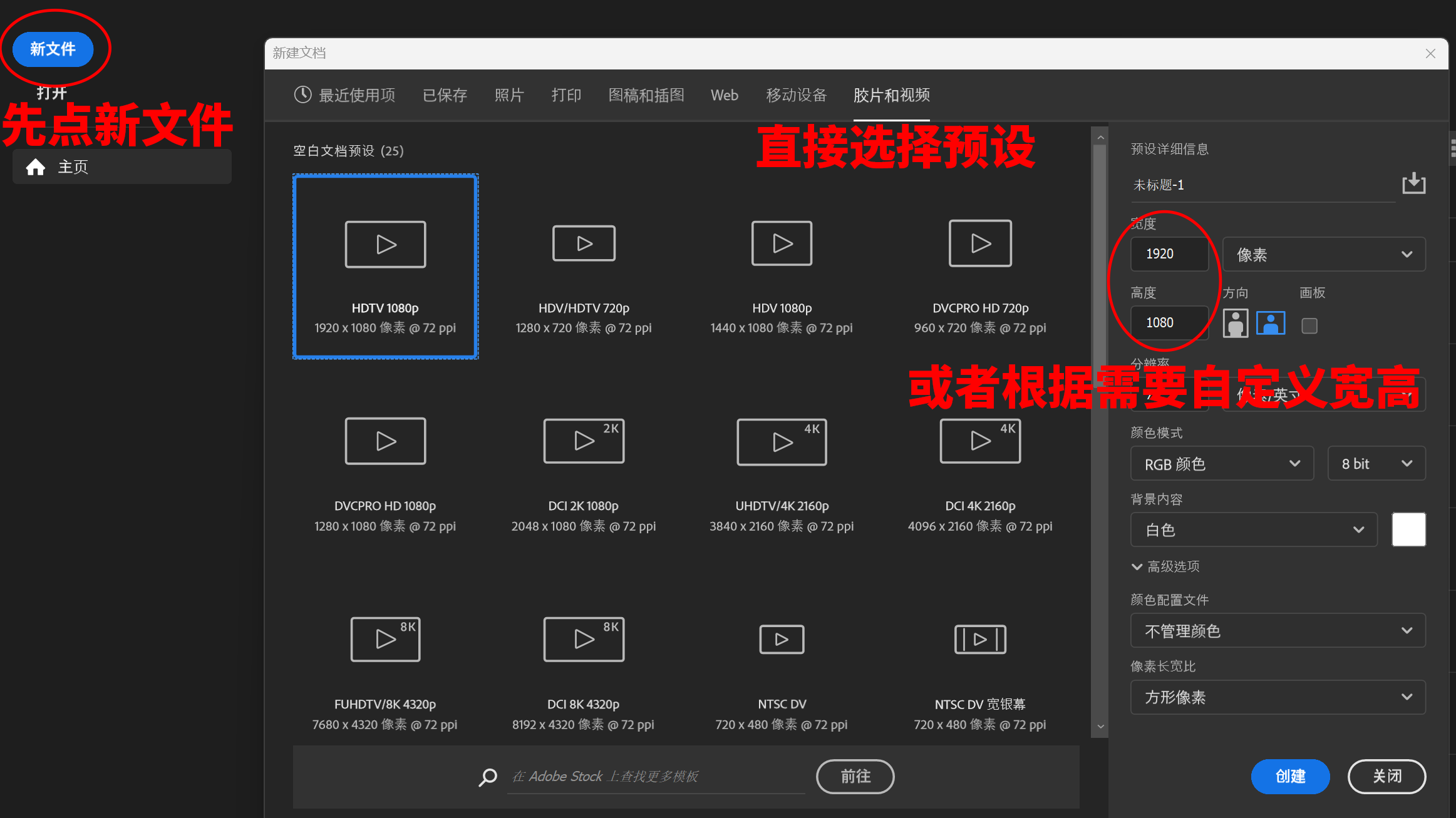 可以通过直接选择预设好的配置,也可以在右侧自定义宽高